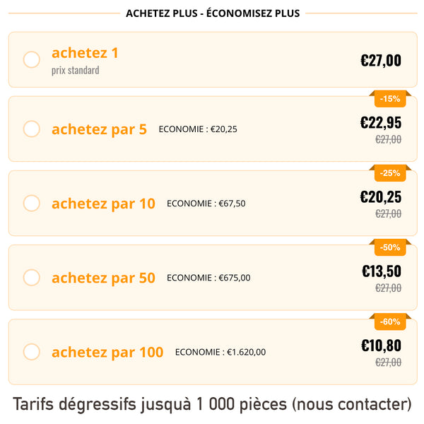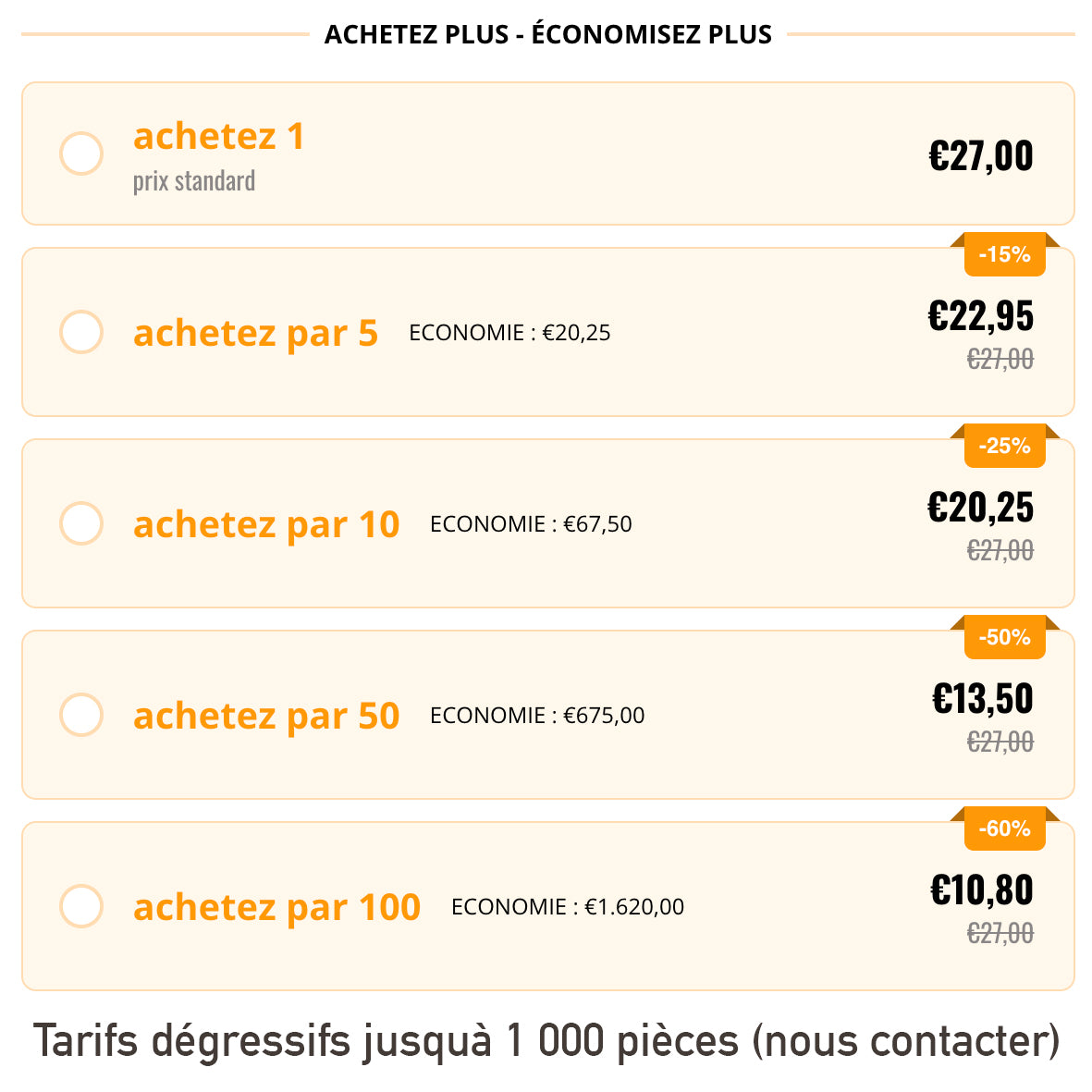 3) Vous pourrez choisir ensuite plusieurs quantités, par taille et par couleur, avec des tarifs dégressifs selon les volumes.