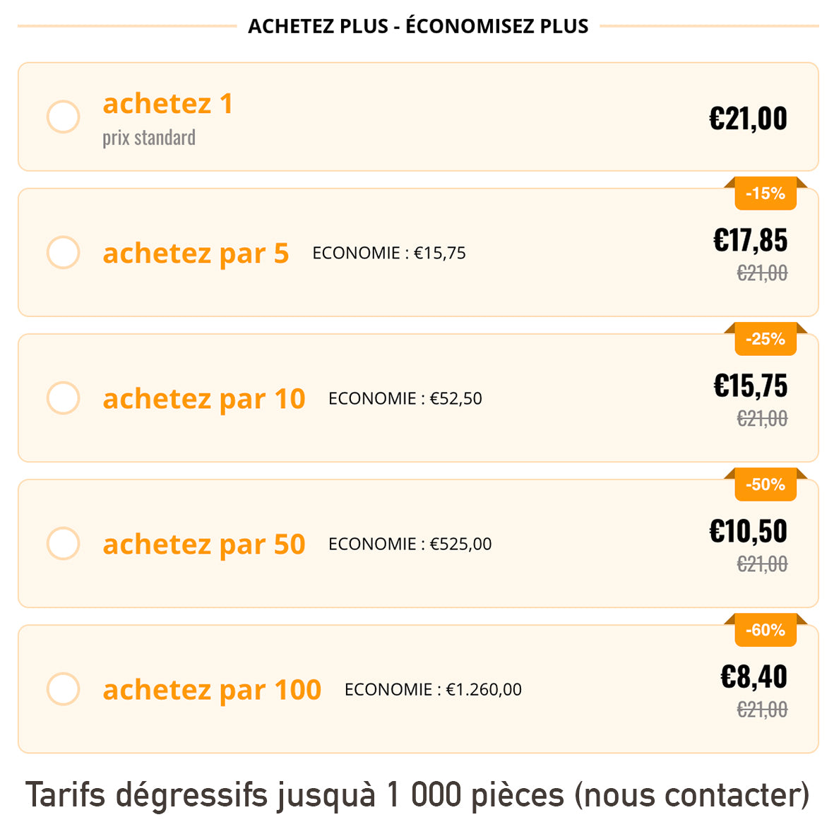 3) Vous pourrez choisir ensuite plusieurs quantités, par taille et par couleur, avec des tarifs dégressifs selon les volumes.